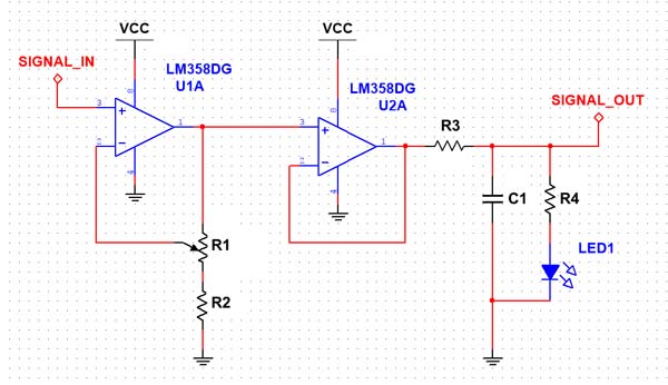 • Buffering Stage: The output of the first op amp is fed into the input of another op amp. But notice this time that, while the output of the second op amp is being fed back, there are no additional components. Therefore, our op amp is likely applying a gain of one (1), or, in other words, it’s simply buffering the input signal.