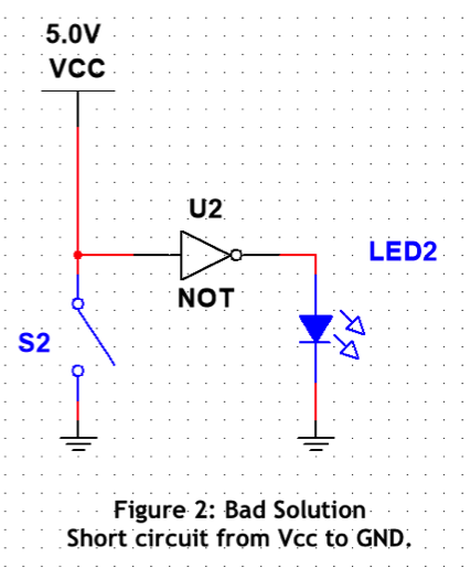 You might be tempted to solve the problem with a solution seen in Figure 2. The problem with simply connecting the input to Vcc occurs when you press the button and create a short circuit between Vcc and GND. The short circuit could generate enough heat to damage your circuit. Or at the very least cause power supply voltage to drop to ground potential resulting in a non-functioning device. In short, bad things will happen.