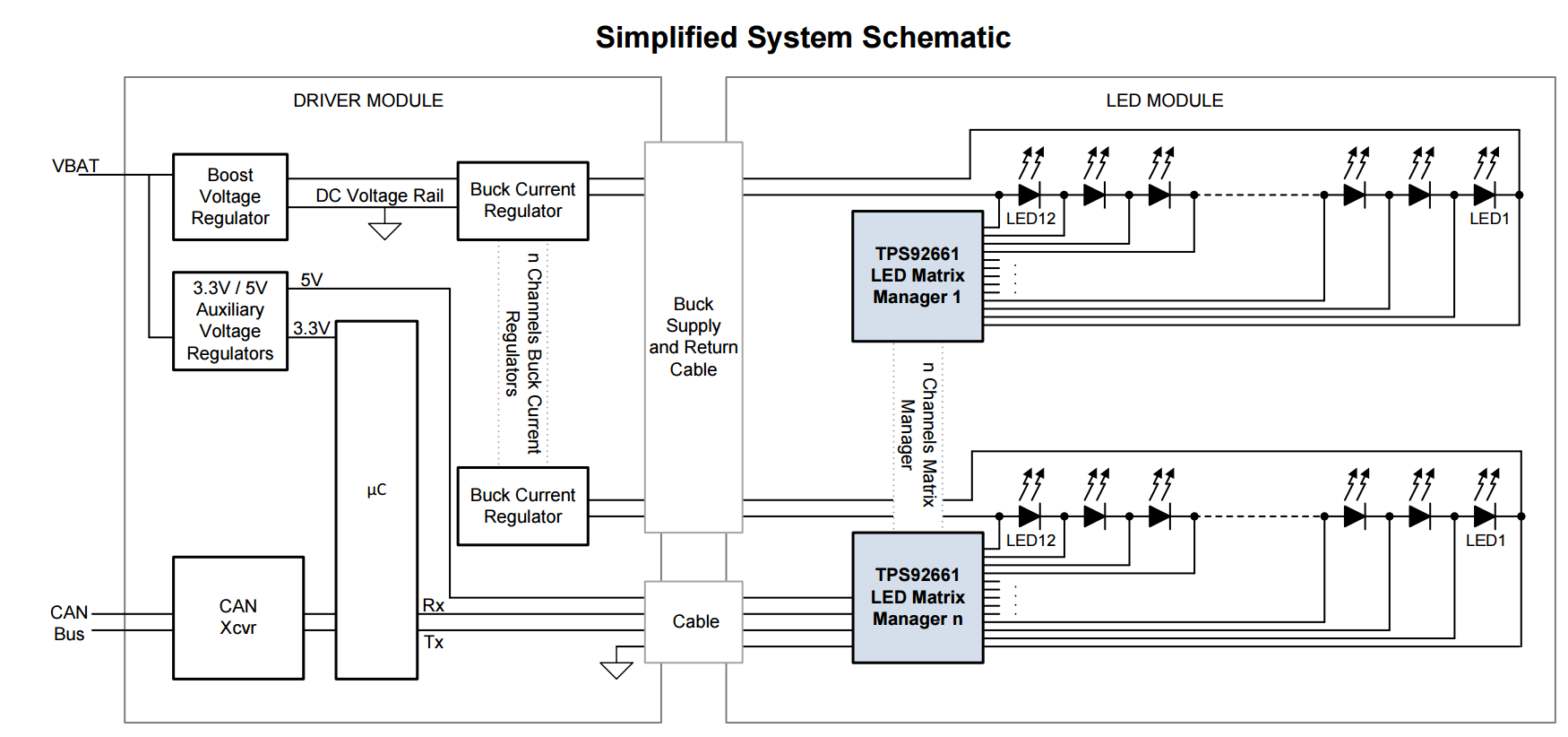Figure 1: TI's TPS92661-Q1 device is a compact, highly-integrated solution for shunt FET dimming for large arrays of high-brightness LEDs in applications such as automotive headlights.