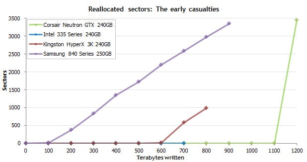 A chart from Tech Report's SSD Lifetime testing showing reallocated sectors piling up over many writes. Source: techreport.com