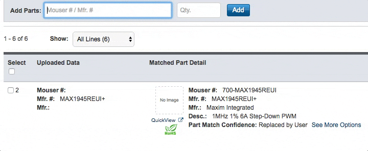 From the BOM Toolbar, you can add a single new line to your BOM. Enter a product number (either a manufacturer or Mouser part number) and a quantity. Mouser's matching process will use your provided options to find the best result.